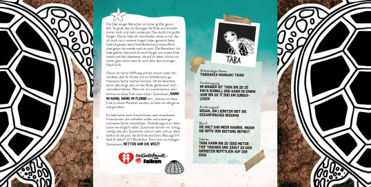 Die Schildkröte Tabwakea Manaaki Taiao – kurz „Taba“ genannt – hat sich mit einer Bitte an uns gewandt: Wir sollen gemeinsam mit ihr, Hand in Flosse, die Welt retten.
